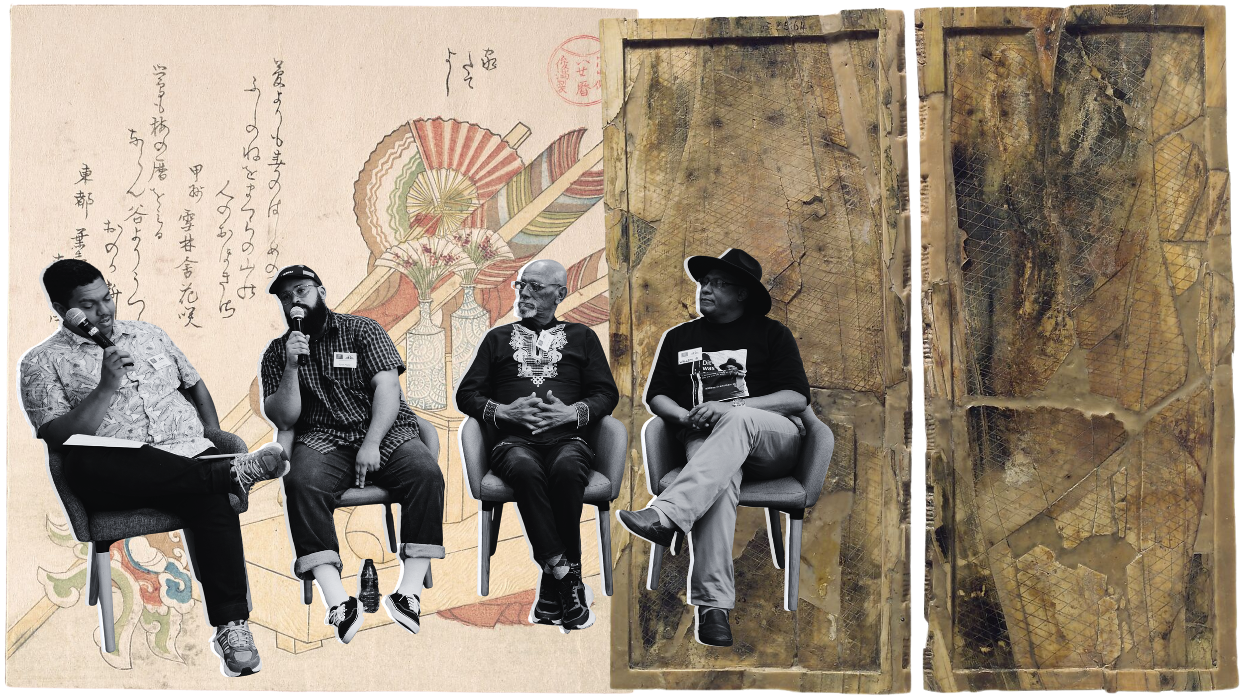 Snippets uit Ceremonial things for the celebration of setting up a new house (Kubo Shunman) en Panels of a writing board. Foto’s van Swart Afrikaanse Skrywersimposium verskaf