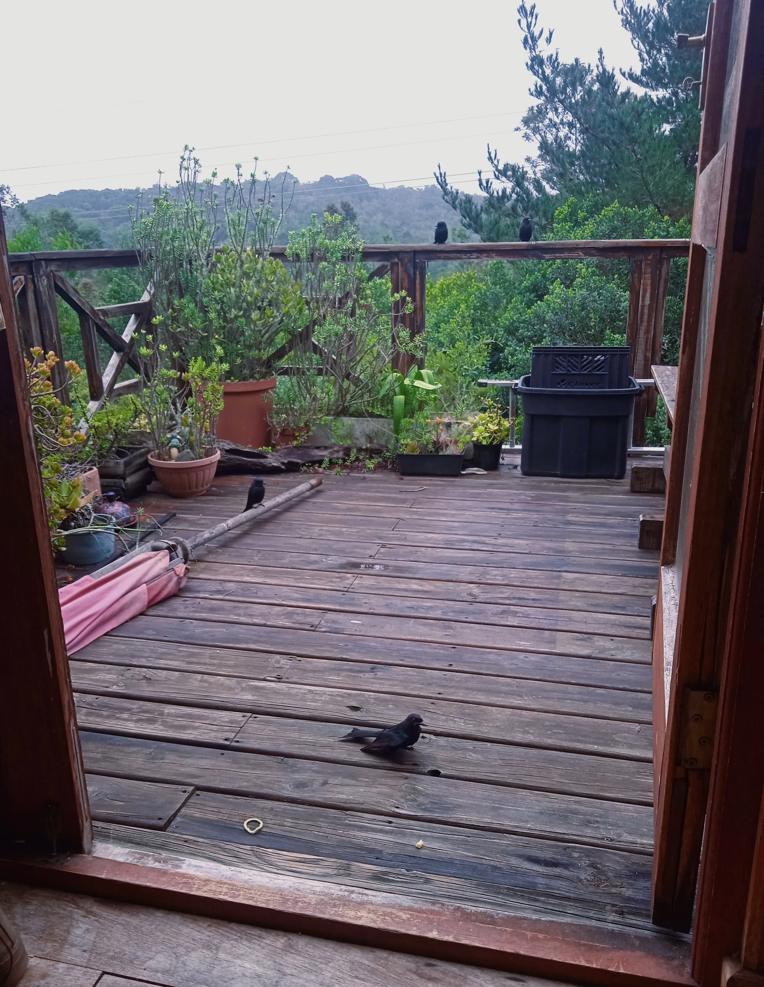 Vanoggend word ek wakker met ’n naamlose hartseer in my lyf. Ek gooi al my deure oop, maak vir my ’n koppie koffie en gaan sit op die dek. Voor my ’n volmaakte uitsig oor die woud. Dis winter, maar na ’n klompie reëndae sê die weervoorspelling dit gaan vandag bloedig warm word. Reeds tuimel ’n warm wind deur die huis; wanneer dit tussen asemteue vir ’n ruk gaan lê, weerklink die oggendgesange van voëls glashelder deur die bos. Kakelaar, lawaaimakerjanfrederik, grootloerie, bosloerie, bosduif, tortelduif, fiskaallaksman, bontrokkie, mikstertbyevanger, swartkopwielewaal, suikerbekkie. En ander, soveel ander waarvan ek nie die name ken nie: klein, vaal voëltjies met groot attitudes, swerms vol singende moeilikheidmakers, ondeunde koggelaars, skinderbekke. Dit wemel van die gesels.
