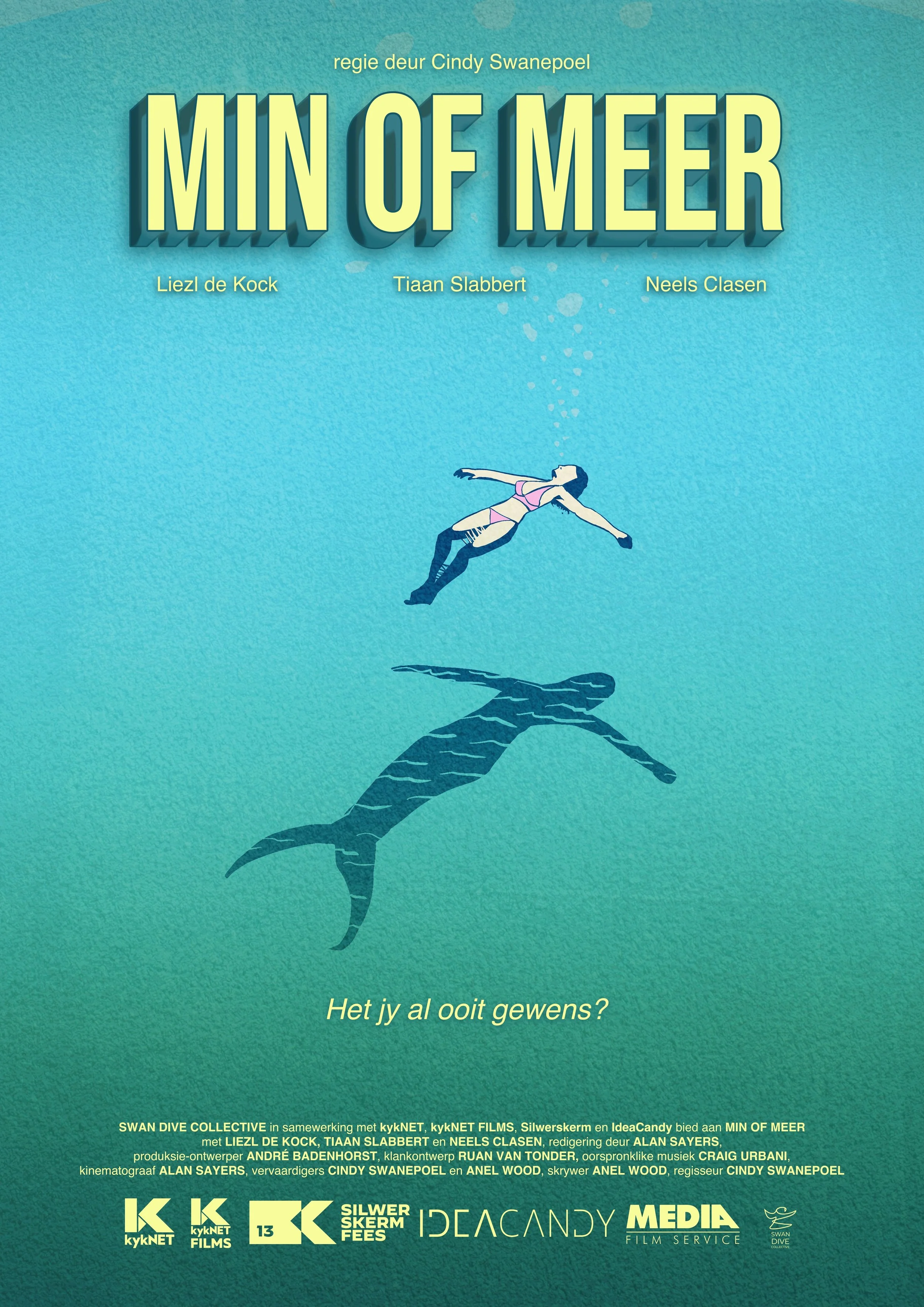 Min of meer vertel die verhaal van Jana (Liezel de Kock), ’n vrou wat glo sy is ’n meermin (vandaar die woordspeling in die titel – bonuspunte vir hierdie kyker). Jana dra permanent ’n meerminstert. Om rond te beweeg op droë land stoot sy haarself op haar maag op ’n skaatsplank rond, of haar man, Jakob (Tiaan Slabbert), stoot haar in ’n kruiwa. Sy is die gelukkigste in die water (Jakob spuit gereeld Jana se vin met ’n spuitbottel gemerk “vinwater” om haar kunsmatige vin koel te hou, en om die konstante jeuk van die materiaal teen haar mensbene te verlig). Hulle sitkamermure is blou geverf en met regte skulpe versier – die dolfyntjie-standbeeld-, jellie-kers-tipe kitsch.