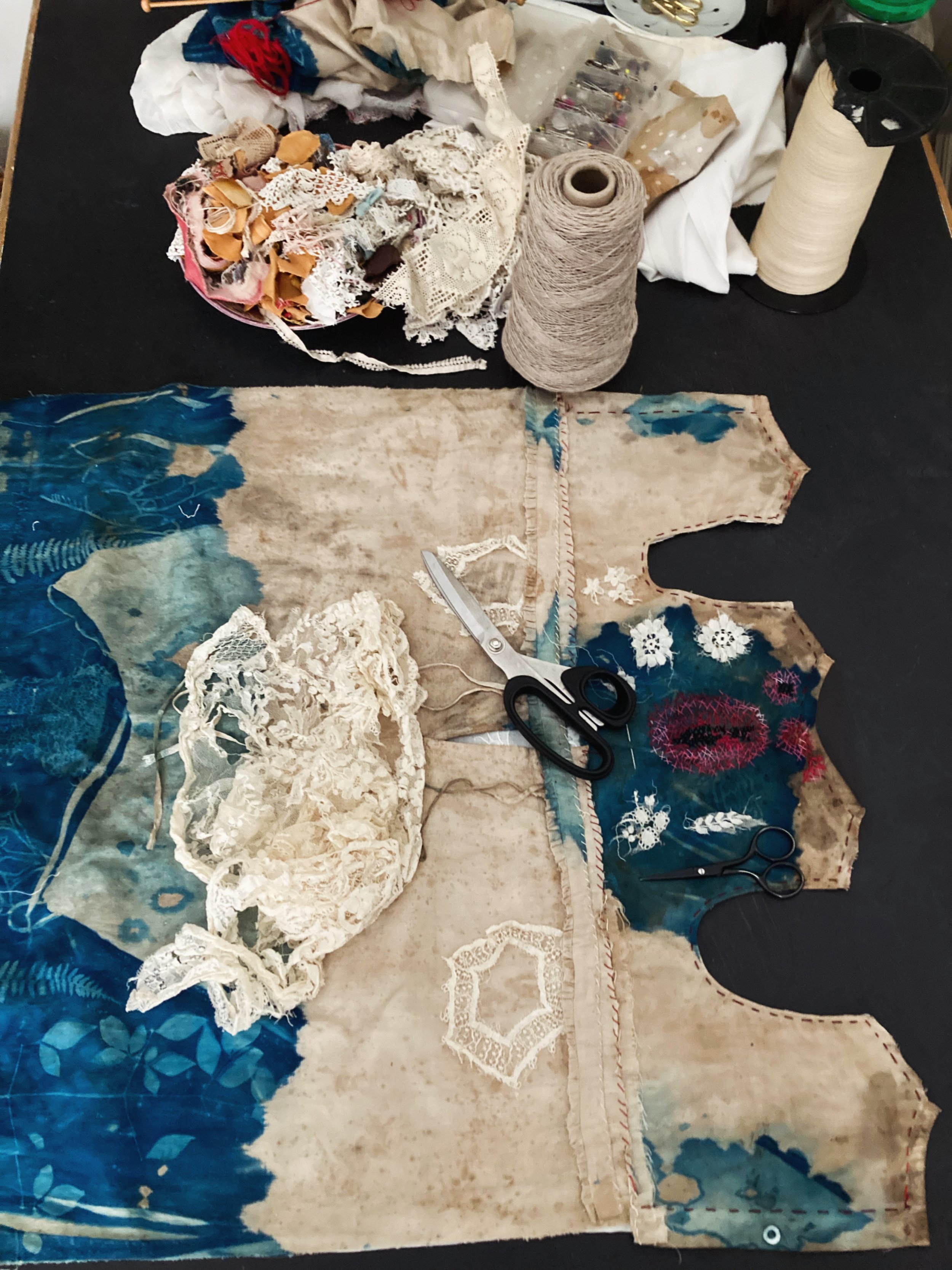 WILLEMIEN: Hierdie is cyanotype en dan ’n tipe ecoprinting. Ek het nie soseer ecoprinting hier gedoen nie, maar ek het roeswater gebruik. Roes is vir my so ’n mooi Afrikaanse woord, want my ma het altyd vir my gesê ek is ’n roes op dit en ek is ’n roes op dat, en ek is ’n roes op skoene. Ek is ’n roes op alles! So ek hou van roeswater. Dan het ek ook yster gebruik. Wat vir my so nice is: In ecodyeing word ’n ysterbad ’n saddener genoem.