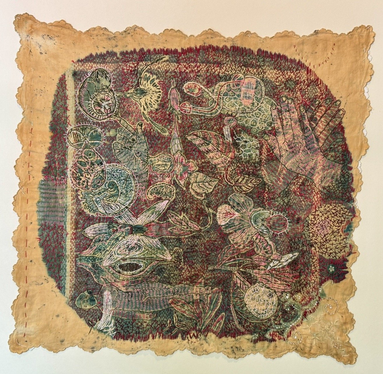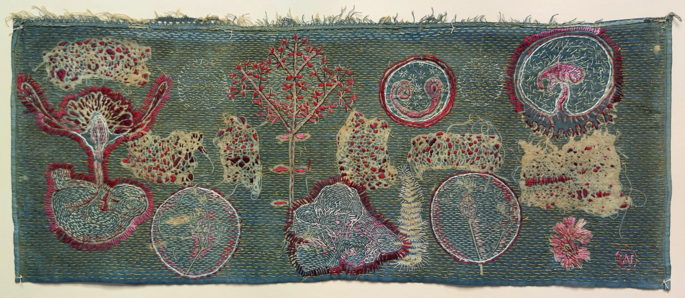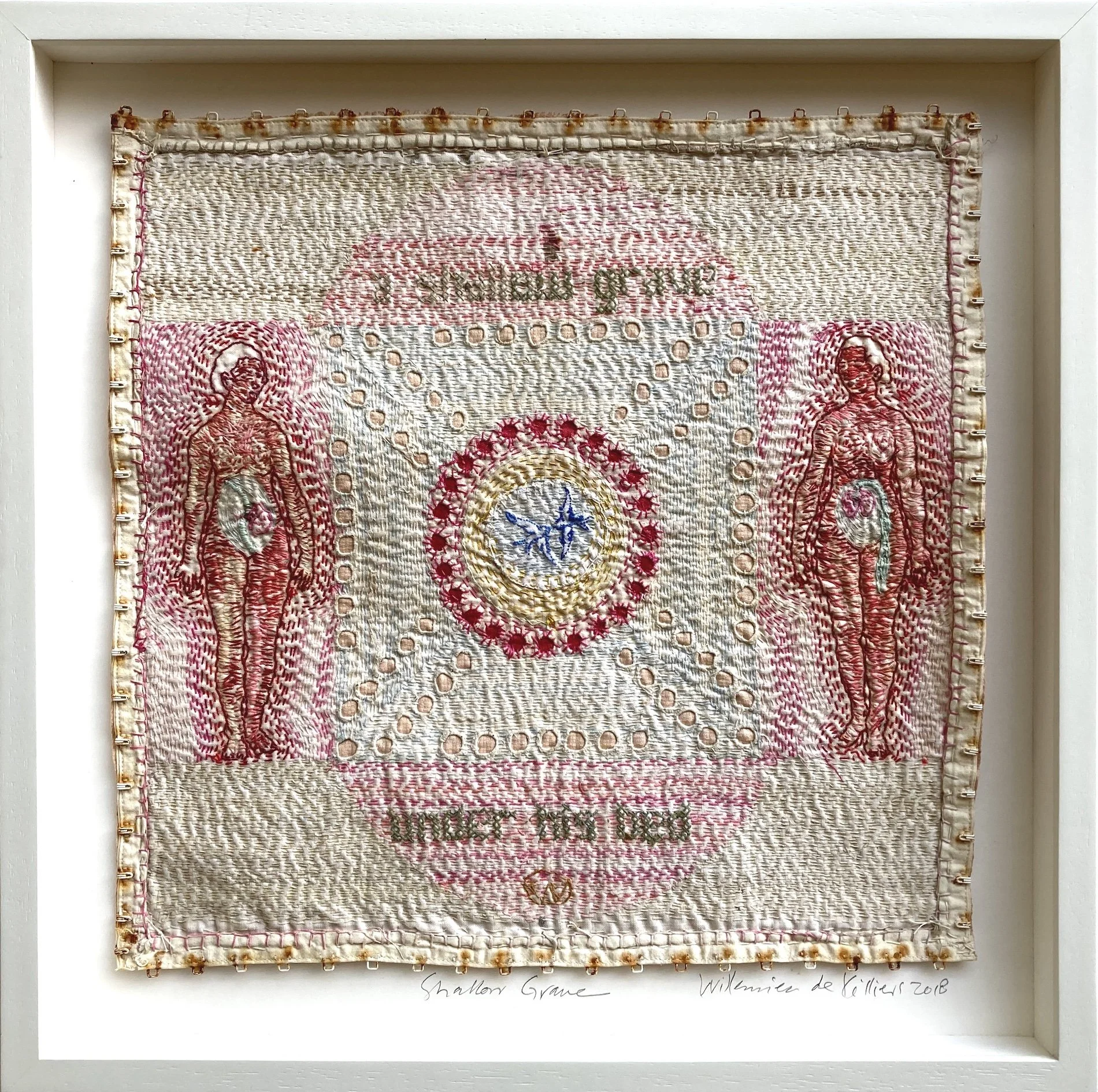 WILLEMIEN: Dit is ’n kombinasie, tien teen een, van bloot visueel en komposisioneel. As ek kyk na iets, weet ek hierdie stiksels moet groter wees. Dis nie noodwendig dat ek nog die wond moet voel wat maak dat ek nou daar moet stik nie. Dit is bloot komposisioneel. Ek begin baie keer uit ’n sterk emosionele posisie, maar die kleure moet balanseer, of hier is te veel stikwerk. So, dis bietjie van ’n kombinasie, maar dis intuïtief.