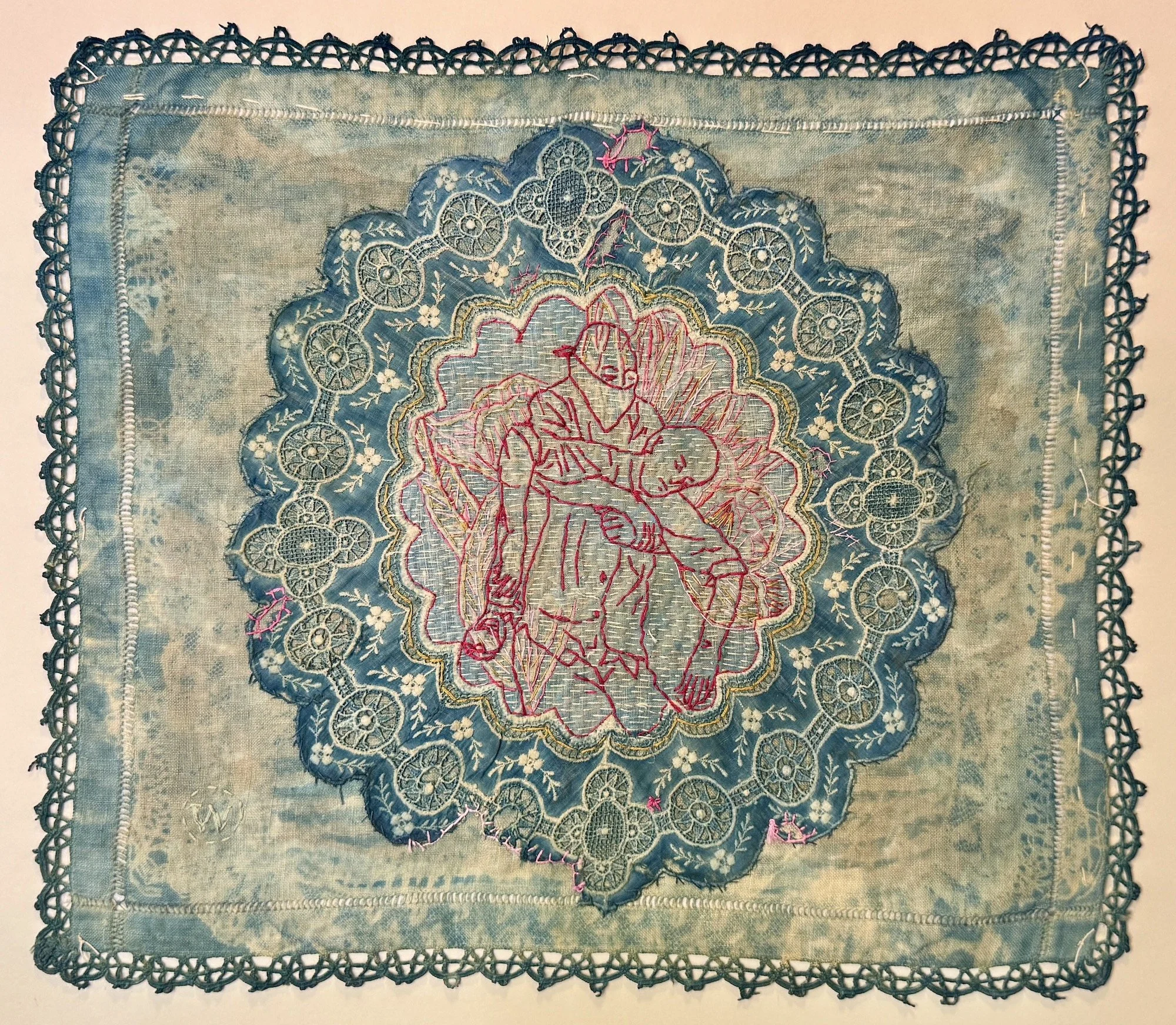 WILLEMIEN: Wel, partykeer werk ek nie. Partykeer gaan klim ek net weer in die bed, want dit gaan net nie werk nie. Wat ek wel weet werk, is ek moet sit en ek moet net stik – dis hoekom ek dié lap het [sy wys vir my ’n lap met fyn naaldwerk daarop] – en wat ek doen, is ek kom terug na dié werk wat ek weet gaan net nooit klaarkom nie. Maar as ek niks het nie, as ek leeggetap is en ek weet nie wat om te doen nie, dan, die oomblik as ek ’n naald en gare in my hand het en ek begin werk, is dit asof ek weet wie ek is en wat ek moet doen, en dan sal daar iets kom.