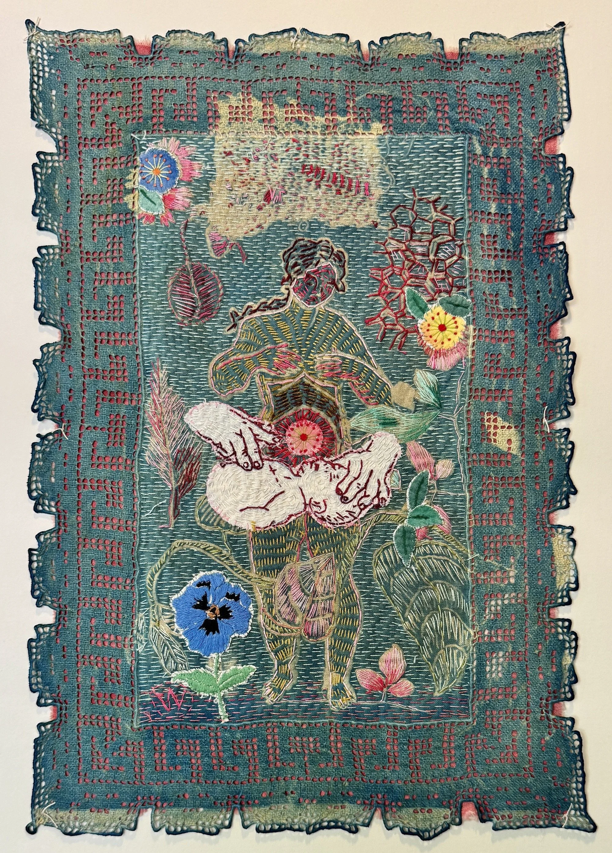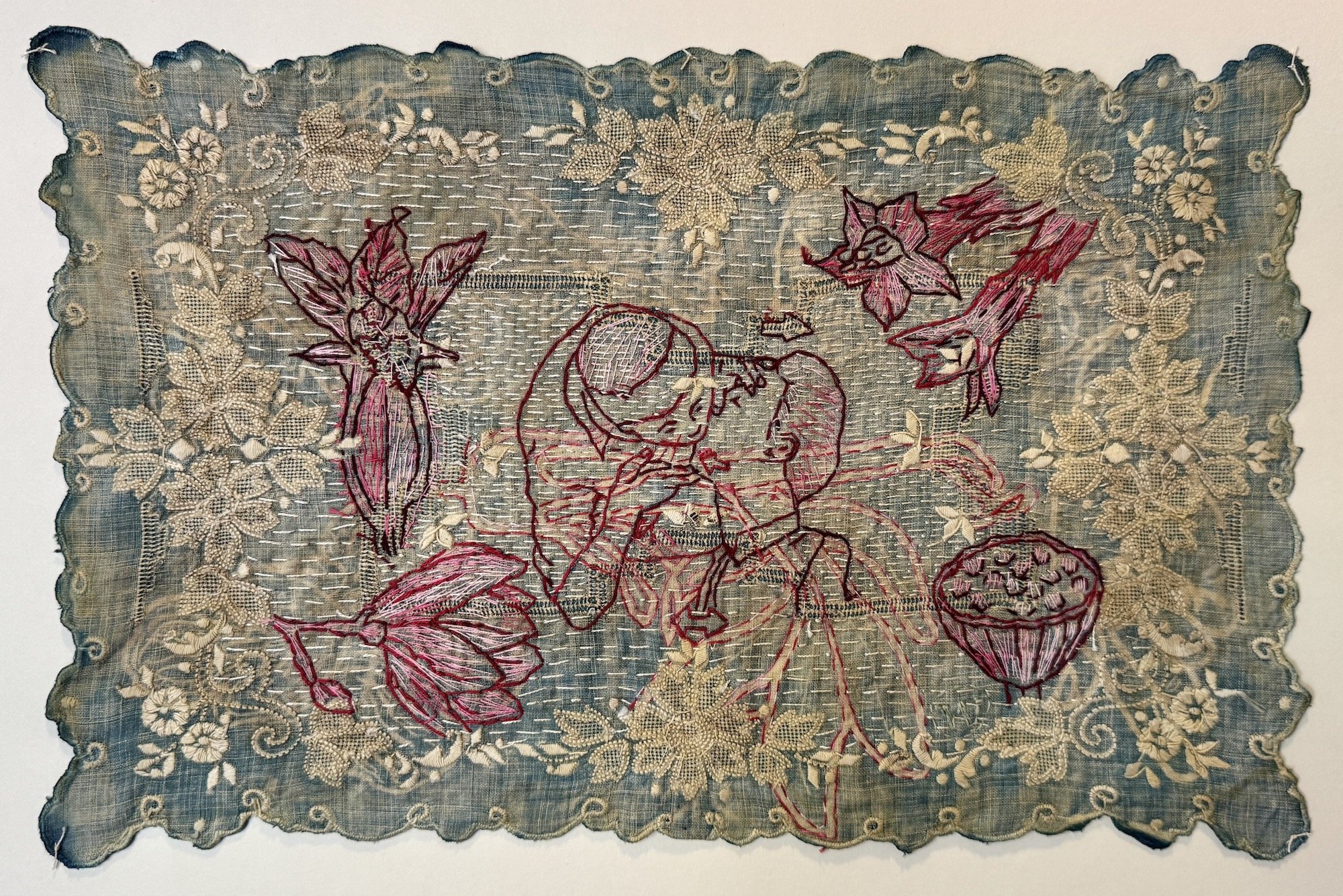 Die werk self, die aksie van om ’n naald in en uit te steek, is meditative, want dit is repetitive en dit vang my partykeer, veral met wat nou aangaan in die wêreld. Ek praat nou nie net van Gaza nie; ek praat van die hele wêreld. Mense, ons het almal mekaar nodig. We have to save each other. Want, god alleen weet, daar gaan niemand anders kom nie. So, ek het nou ’n reeks wat ek Kiss of life noem en daar is ook ’n Save me by wat vir my regtig op daai vlak healing is. Kom ons gaan kyk daarna.