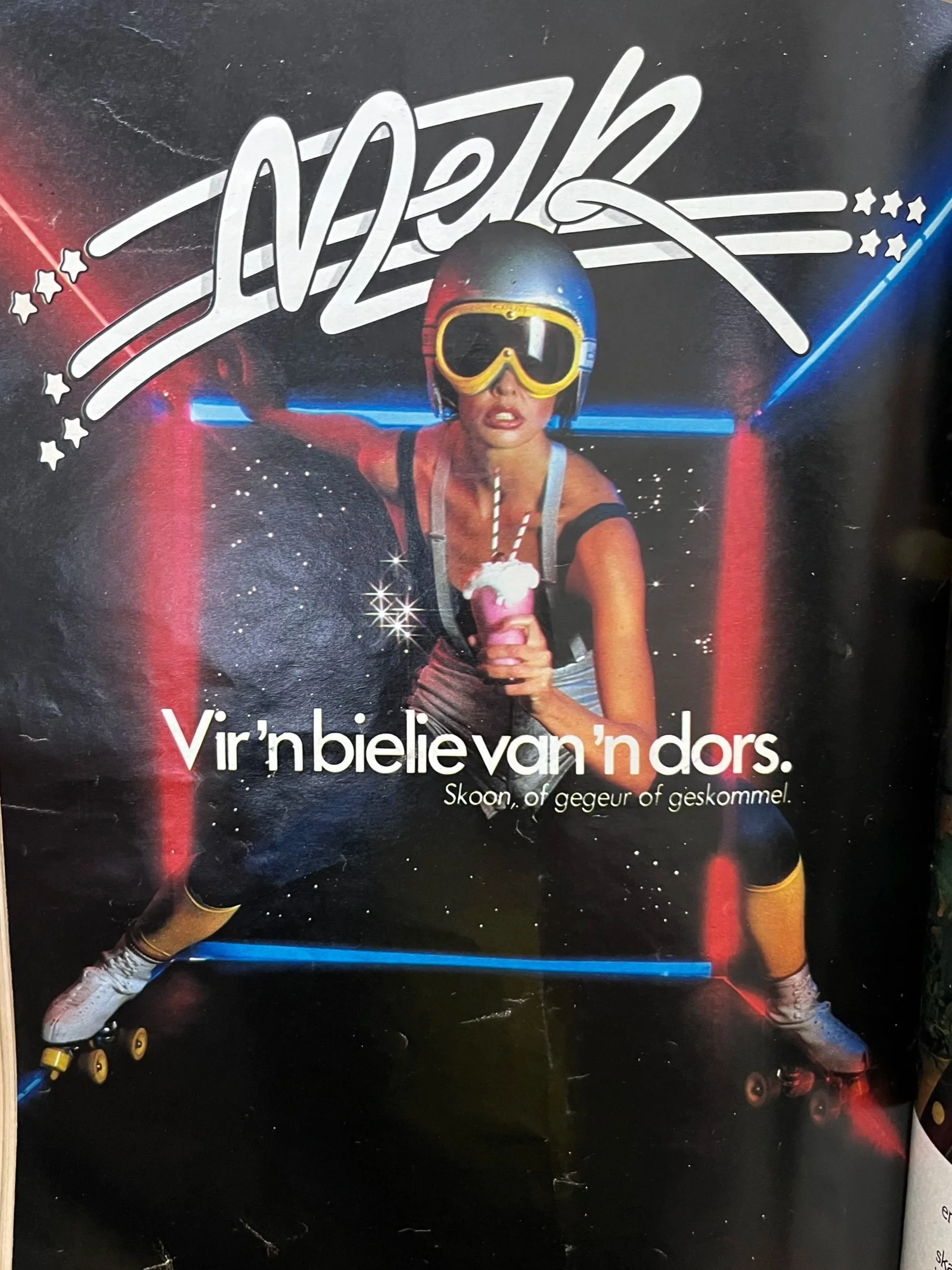 Huisgenoot, 1980. Het jy ’n bielie van ’n dors? Drink melk! Die adverteerder was die Suid-Afrikaanse Suiwelraad, uit die era toe bemarkingsrade hele produkkategorieë (soos melk, kaas, of vrugte) sou bemark, eerder as spesifieke handelsmerke (soos Clover of Dairy Fresh). Hierdie advertensie was duidelik ’n poging om te spreek tot “cool”, jong kinders. Onderaan die advertensie kon jy selfs ’n poster-grootte print bestel. Ek wonder hoeveel tienerseuns het destyds hierdie beeld teen hulle muur gehad.