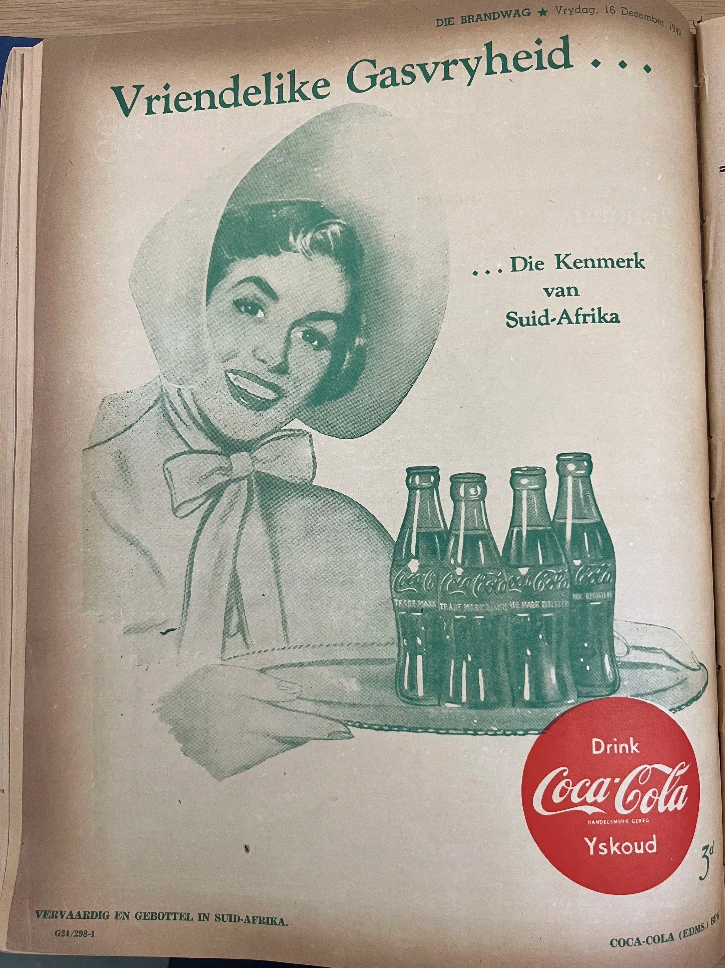 Coca-Cola se feestyd-advertensies het baie anders gelyk in 1949, soos hierdie een uit Die Brandwag. Dit was in die Versoeningsdag-uitgawe (toe Dingaansdag) en mens moet byvoeg dat die meeste handelsmerke ook op ’n Afrikaner-tema gespeel het. Vreemd om vandag te sien, maar nietemin belangrik as ’n stukkie geskiedenis.