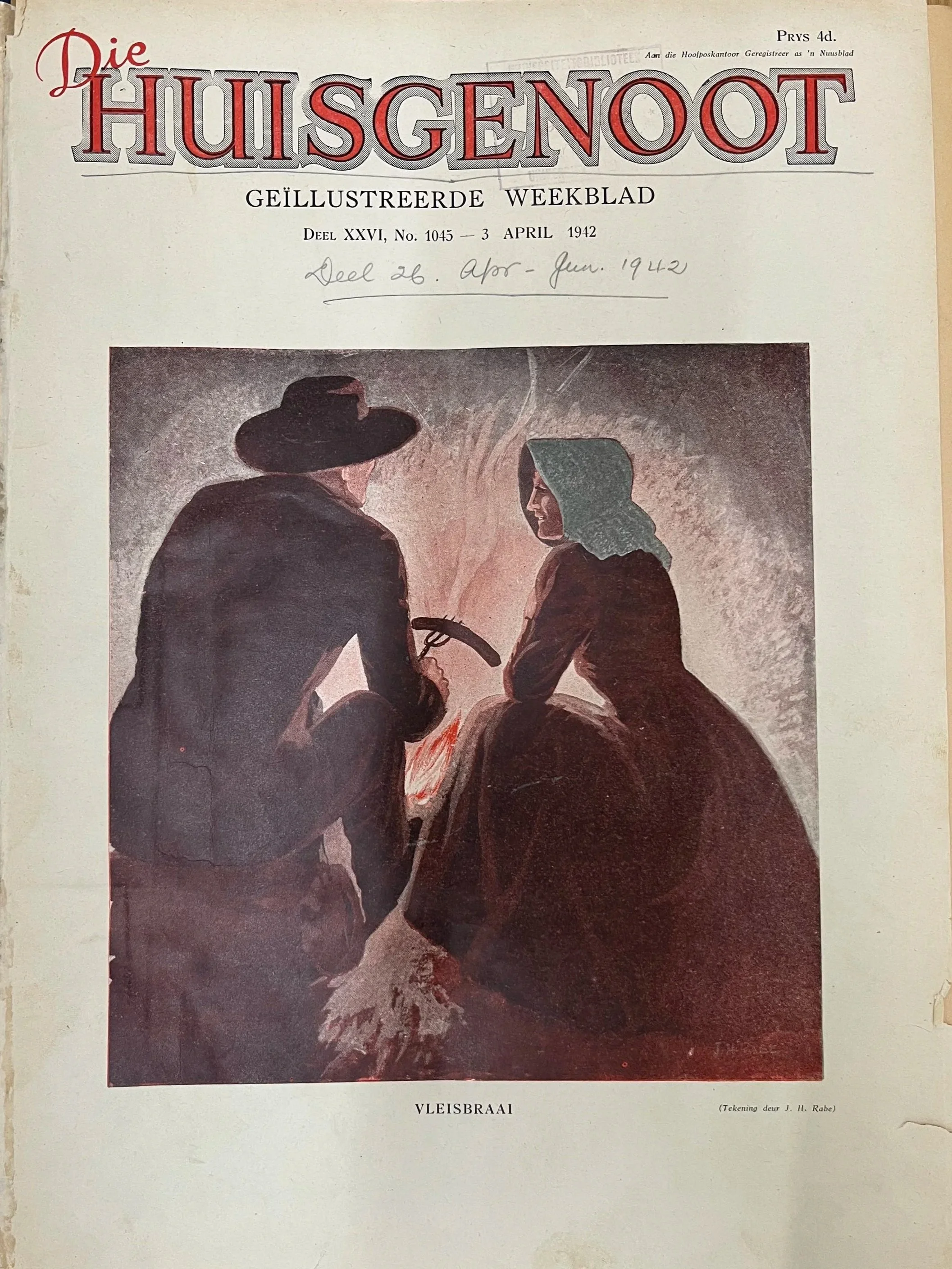 Hierdie Die Huisgenoot-voorblad uit 1942 is een van die oudste braai-uitbeeldings wat ek tot dusver as deel van my navorsing raakgeloop het. ’n Mens kan duidelik die direkte verhouding tussen braai en kamp sien, iets wat op sy beurt gegrond is in die populêre voorstelling van hoe mense tydens die Groot Trek kos gemaak het.