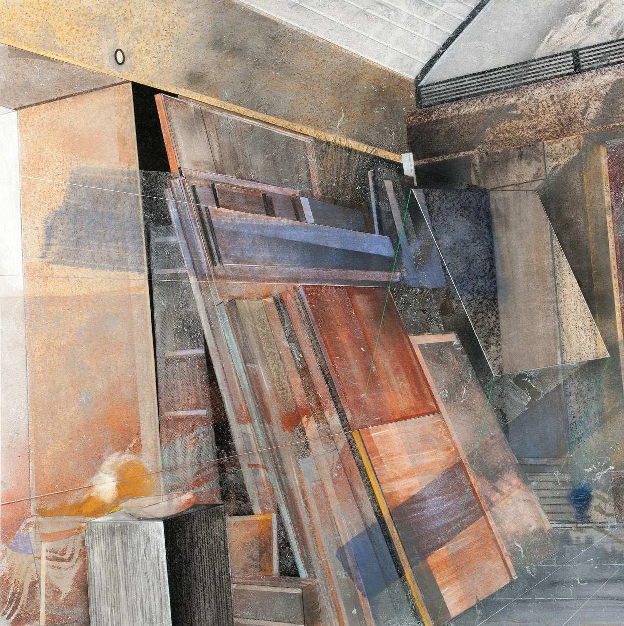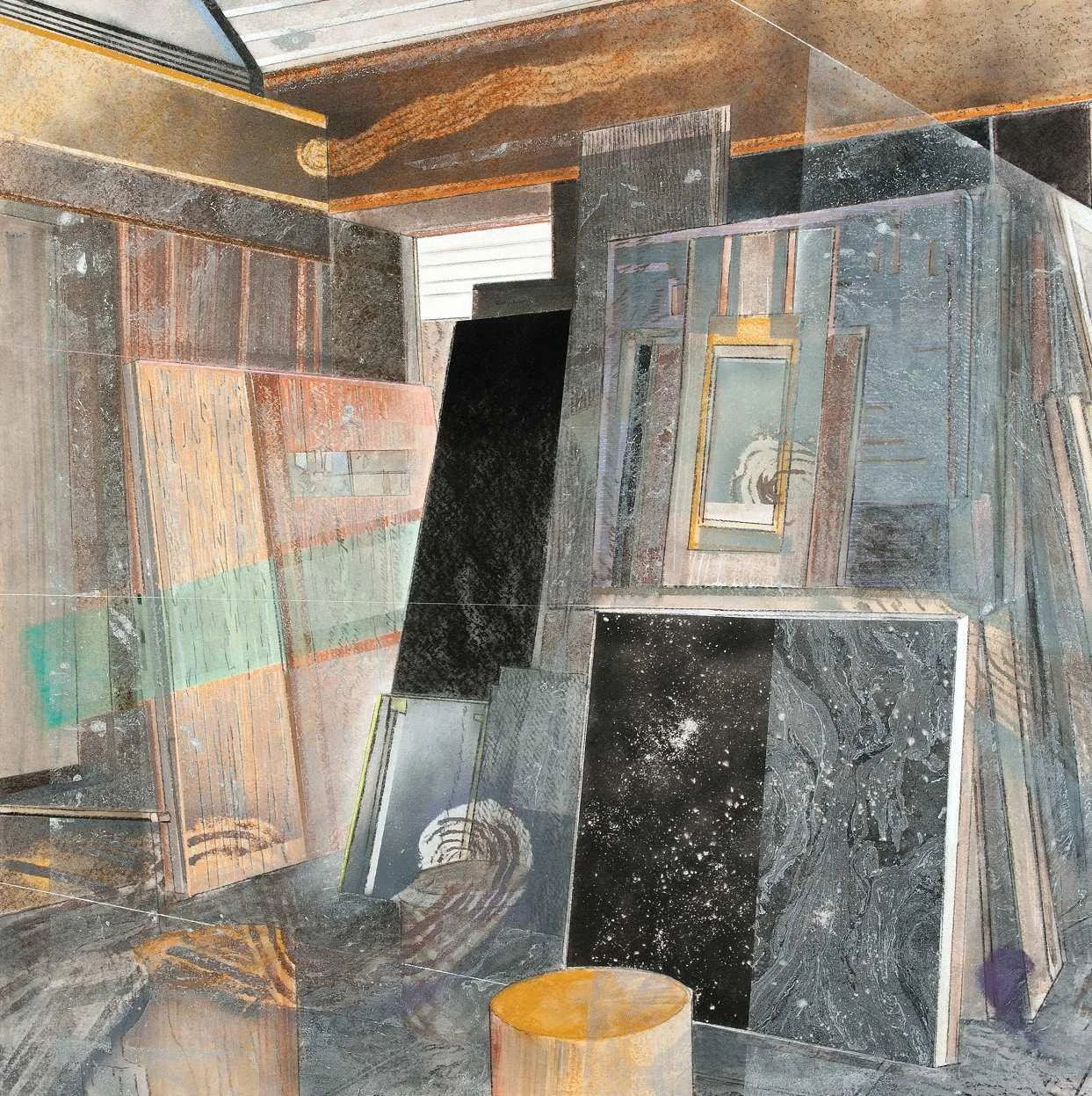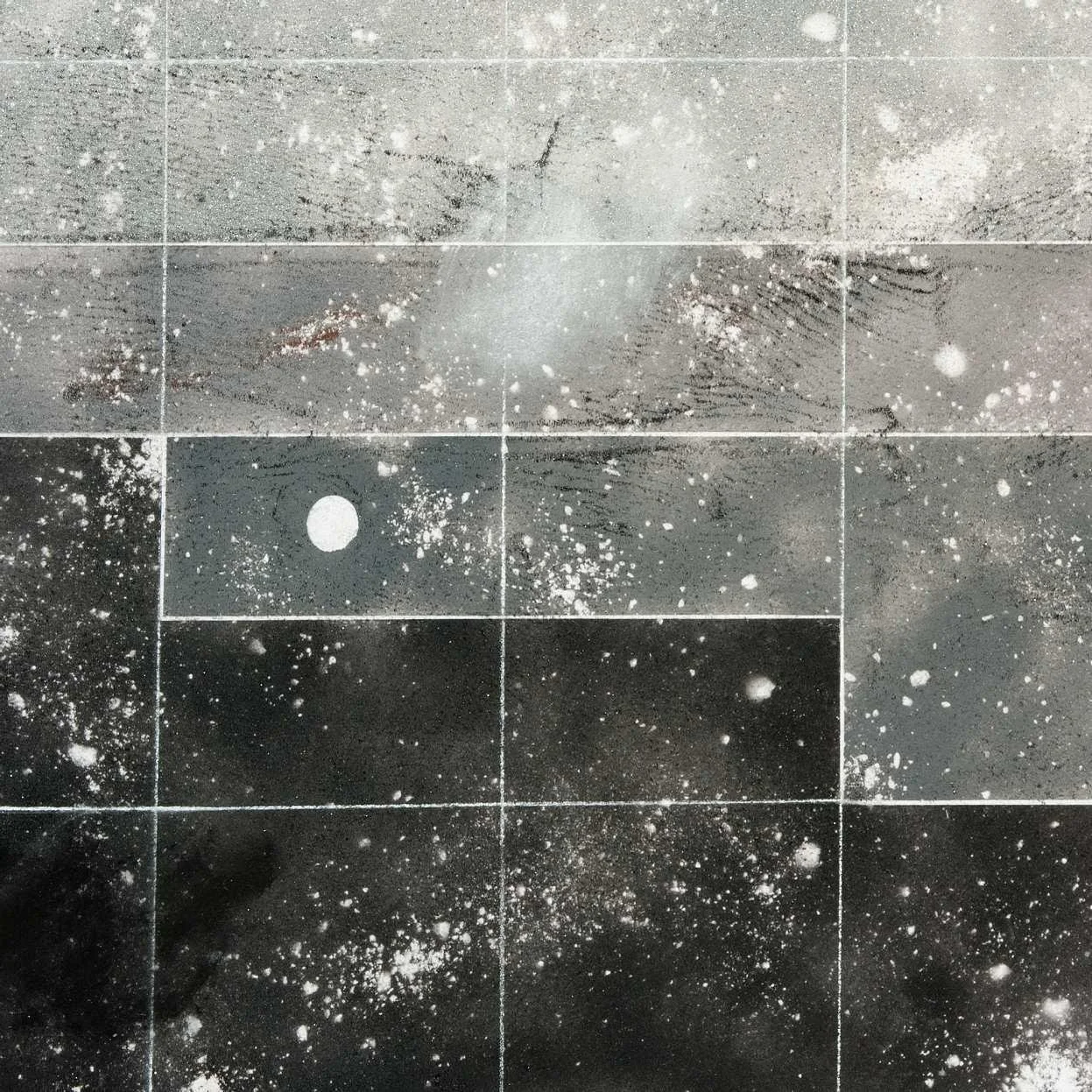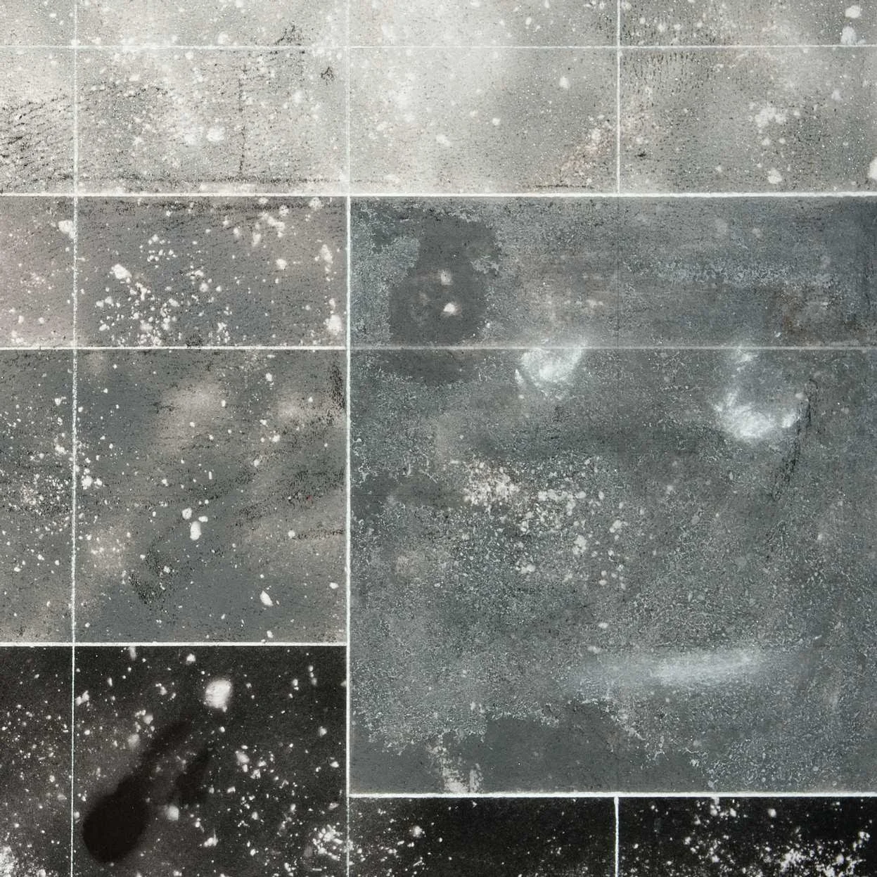 Stacked images (2015). Pastel, metallic dust and dry pigment on bonded fibre fabric, 1800 x 1800 mm.