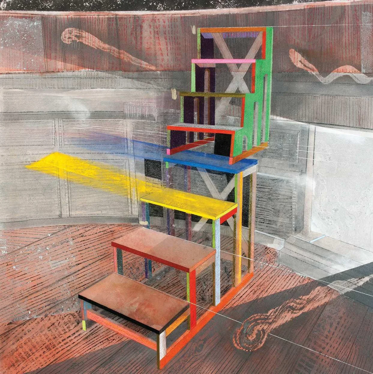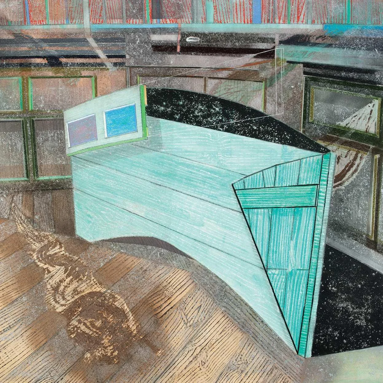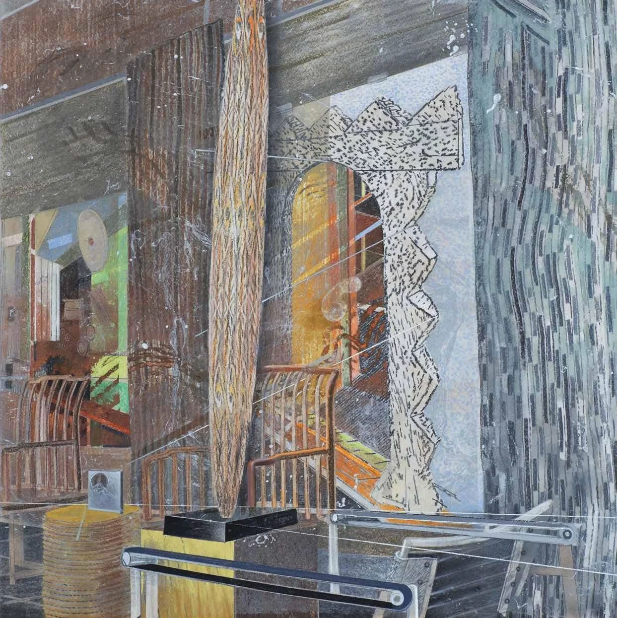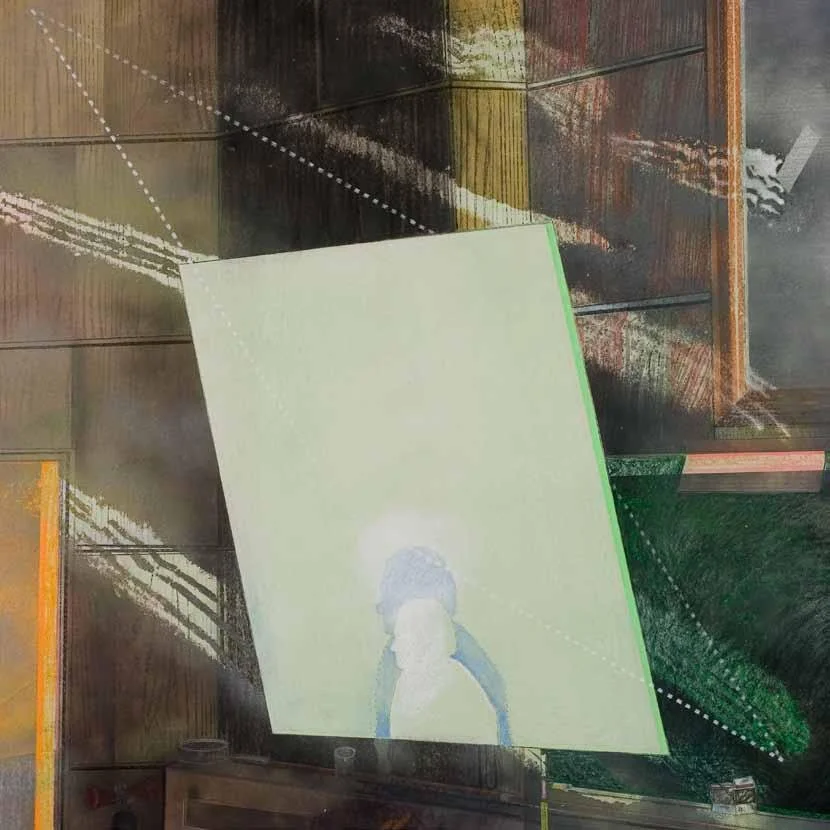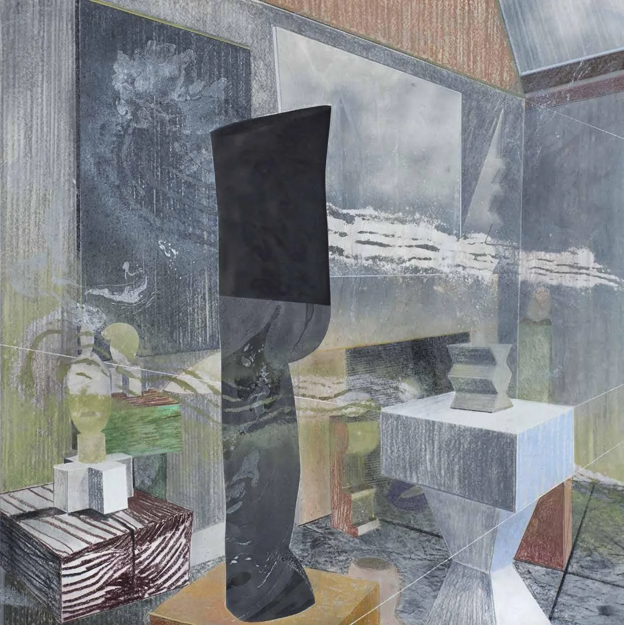 Stacked images (2015). Pastel, metallic dust and dry pigment on bonded fibre fabric, 1800 x 1800 mm.
