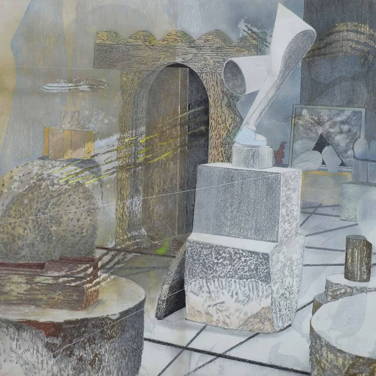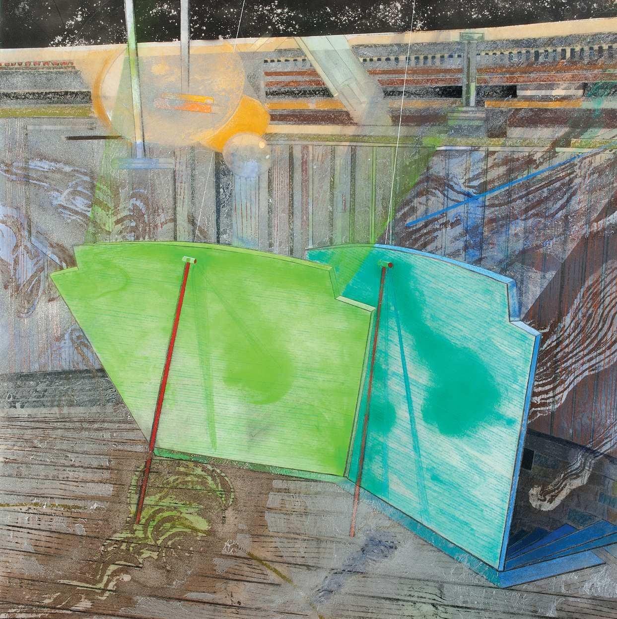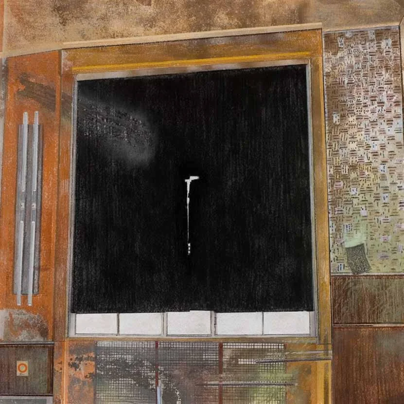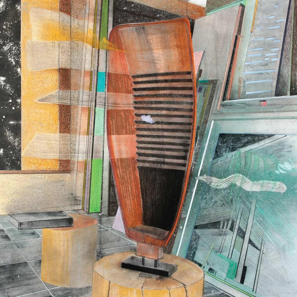 Stacked images (2015). Pastel, metallic dust and dry pigment on bonded fibre fabric, 1800 x 1800 mm.