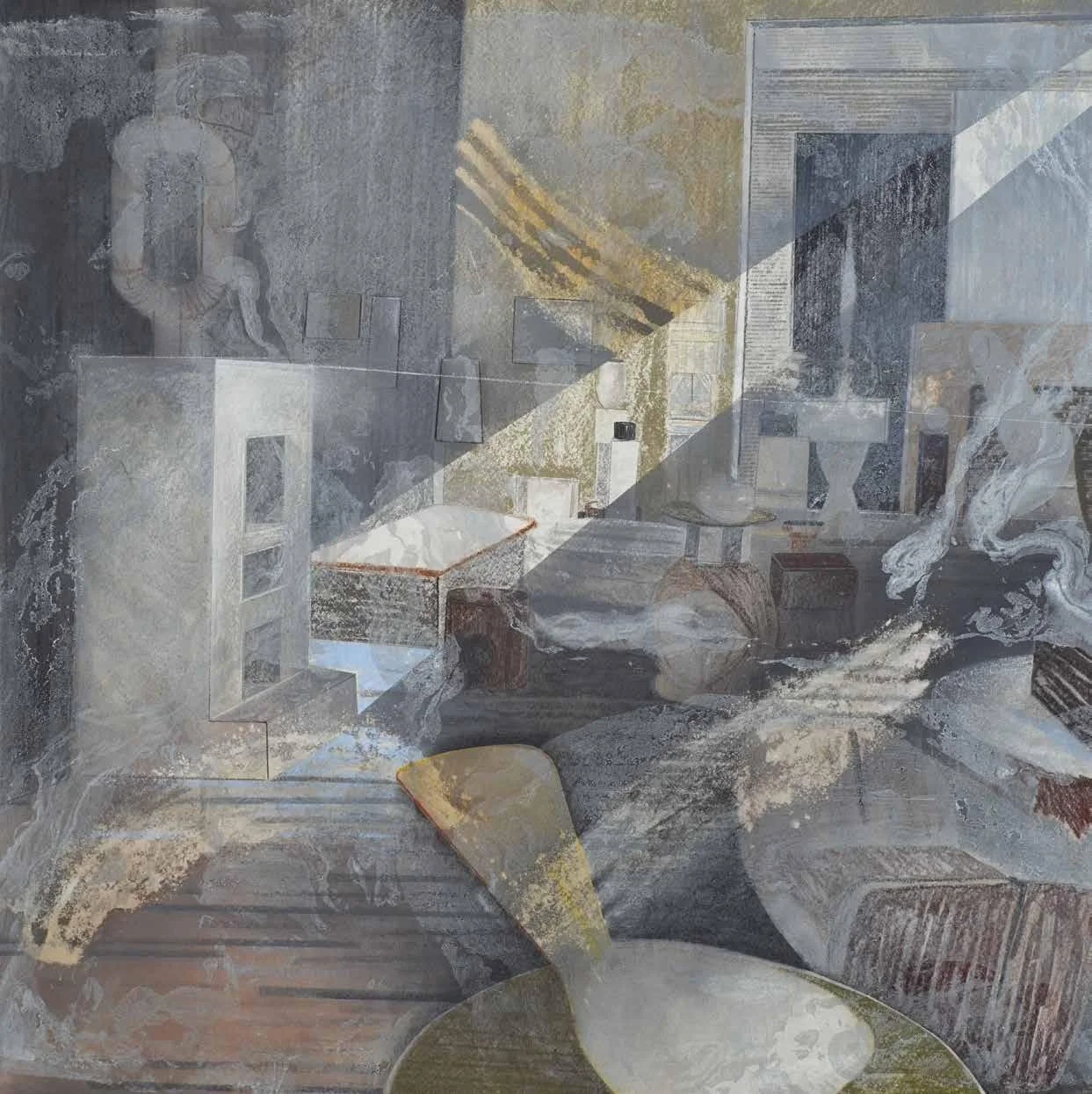 Enfolded space (2015). Pastel, metallic dust and dry pigment on bonded fibre fabric, 1800 x 1800 mm.