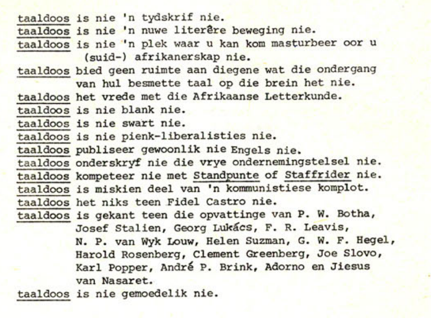 In die tweede uitgawe het die redakteurs enige bydrae verwelkom wat sou “torring aan die hegemonie van onnoselheid waaronder ons tans leef”. Die aggressiewe, onverskillige houding van Taaldoos en die minagting vir konvensie, wet en smaak het die grondslag vir Stet gelê.